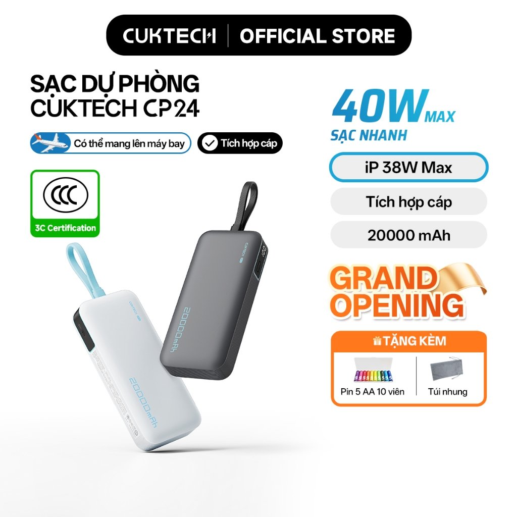 【Ưu Đãi Khai Trương】CUKTECH Pin Dự Phòng 20000mAh Sạc Nhanh 40W – Tích Hợp Dây, Hỗ Trợ iP 38W / Xiaomi 33W —— CP24 Power