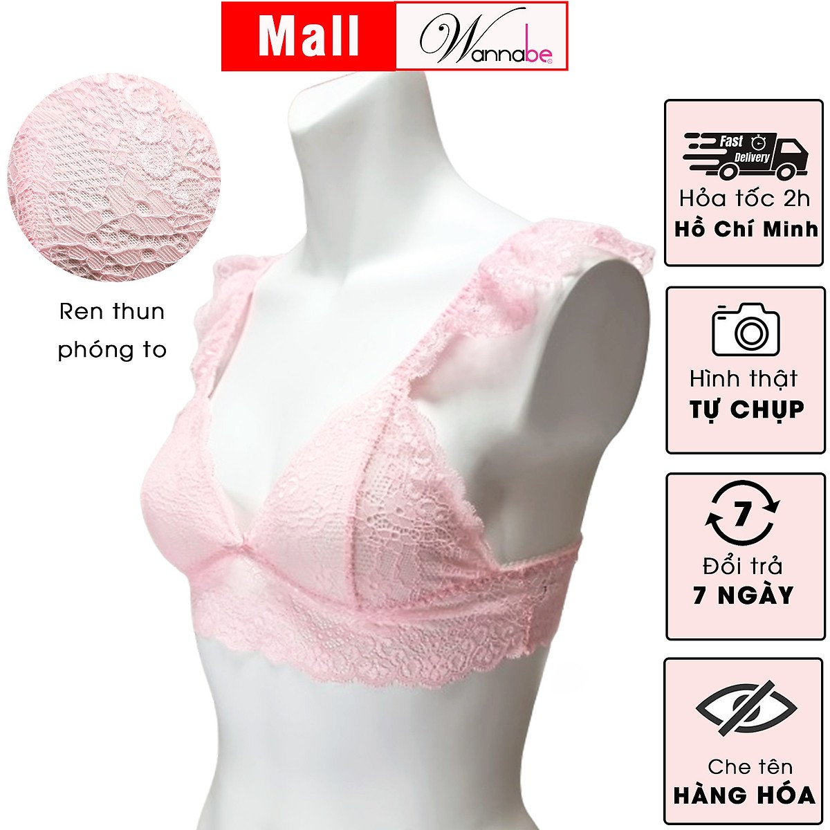 * **Thấm hút và thông thoáng:** Mặc dù là ren, nhưng chất liệu này được thiết kế để có độ thoáng khí nhất định, kết hợp với lớp lót lưới thông thoáng mặt trong bầu ngực, giúp giảm thiểu sự tích tụ mồ hôi, mang lại cảm giác mát mẻ, dễ chịu, đặc biệt trong những ngày nắng nóng.