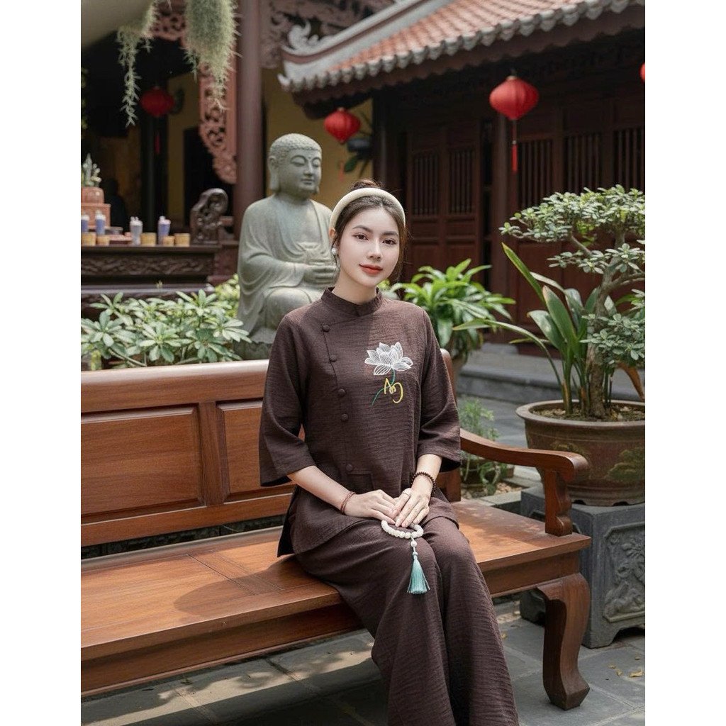 Điểm nhấn đắt giá nhất trên bộ pháp phục chính là hình ảnh hoa sen được thêu tinh tế. Hoa sen trong Phật giáo tượng trưng cho sự thanh cao "gần bùn mà chẳng hôi tanh mùi bùn". Việc đưa họa tiết thêu sen vào bộ bà ba không chỉ tăng thêm thẩm mỹ mà còn giúp người mặc cảm thấy tâm hồn nhẹ nhàng, thanh tịnh hơn khi bước chân vào không gian chùa chiền. Đường thêu chắc chắn, sắc nét, không bị bung chỉ sau nhiều lần giặt.