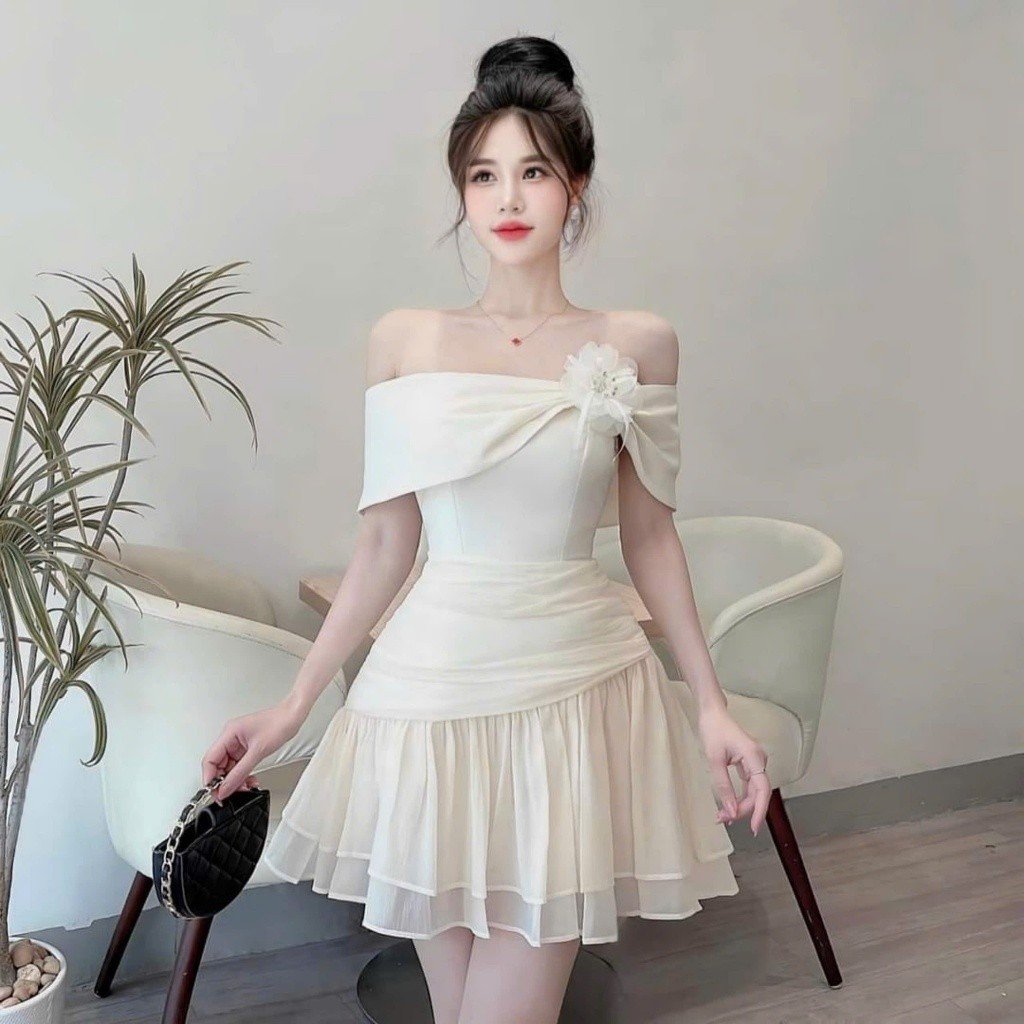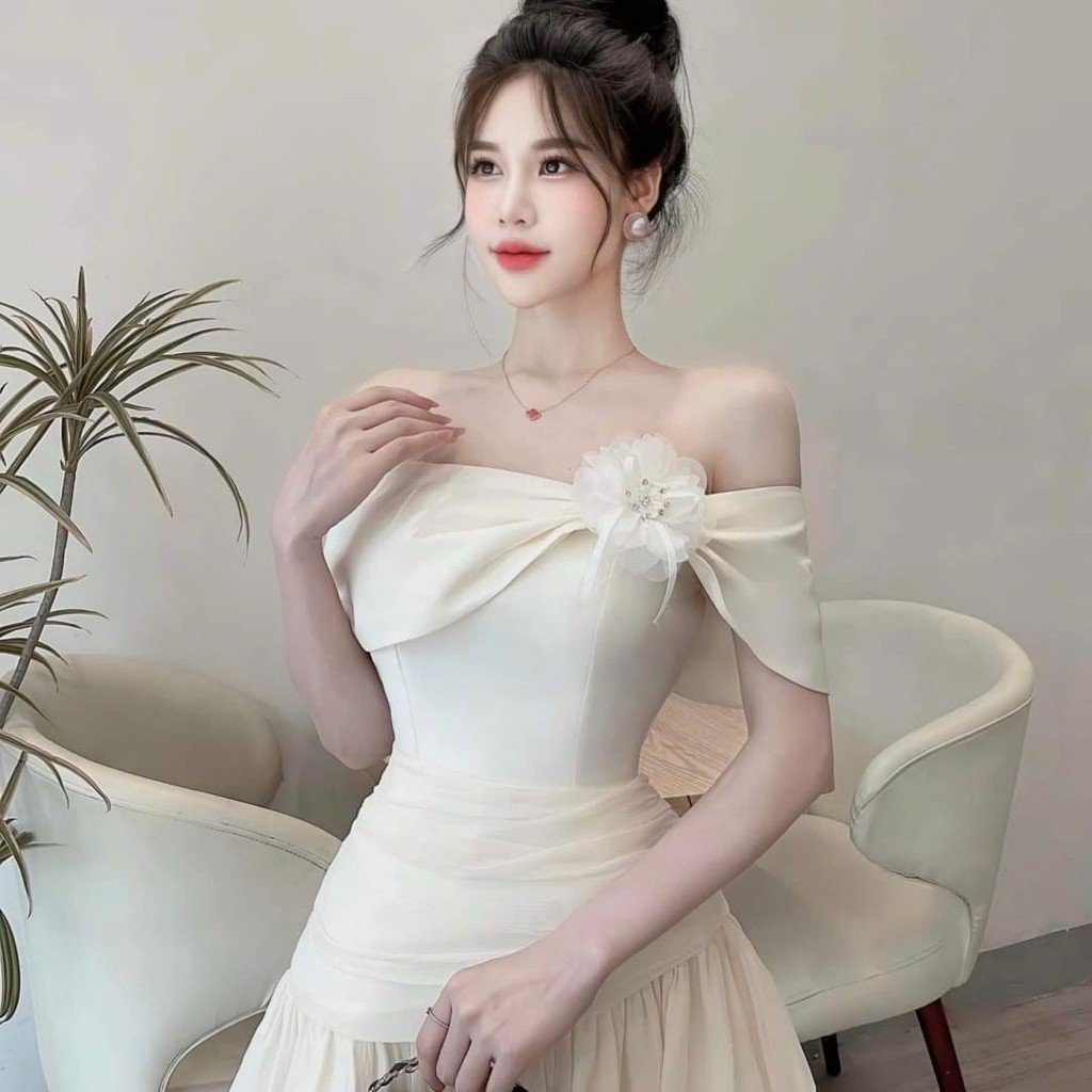 • Kiểu dáng trễ vai quyến rũ: Điểm nhấn đắt giá nhất của chiếc đầm chính là thiết kế trễ vai tinh tế. Đường cắt khéo léo giúp khoe trọn bờ vai trần thon gọn và xương quai xanh gợi cảm, tạo nên sức hút khó cưỡng nhưng vẫn giữ được sự thanh lịch, chừng mực.