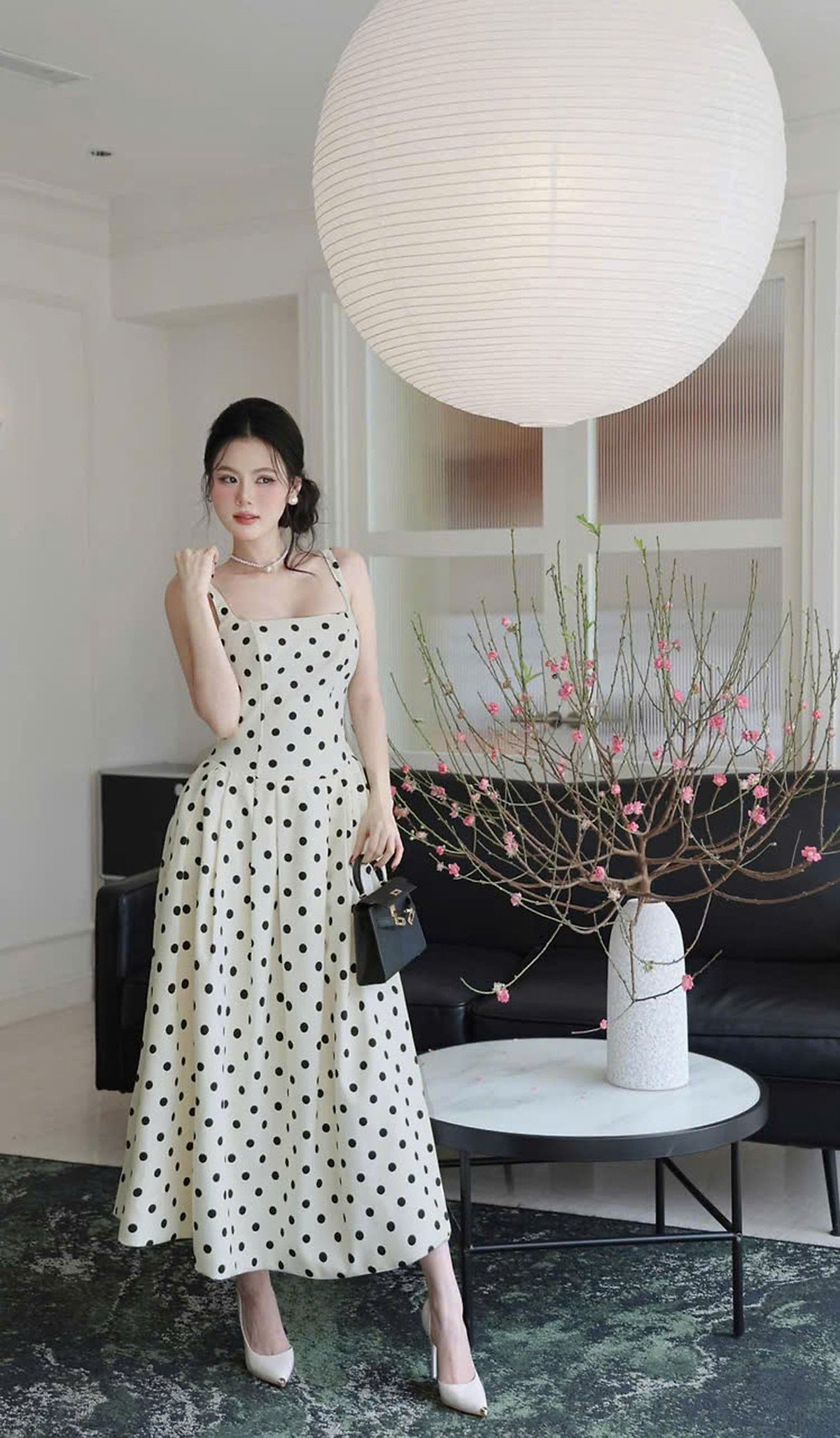 - Sự giao thoa giữa cổ điển và hiện đại: Khi họa tiết chấm bi được đặt trên nền váy hai dây hiện đại, nó tạo nên một diện mạo vừa trẻ trung, vừa có chiều sâu tinh tế.
