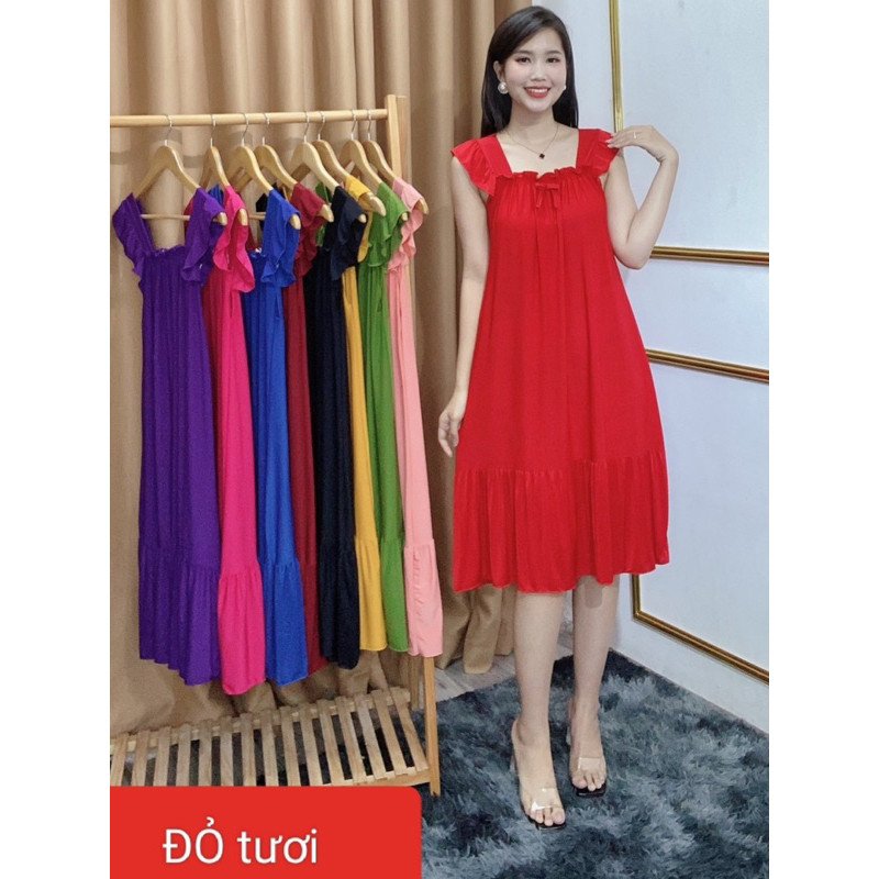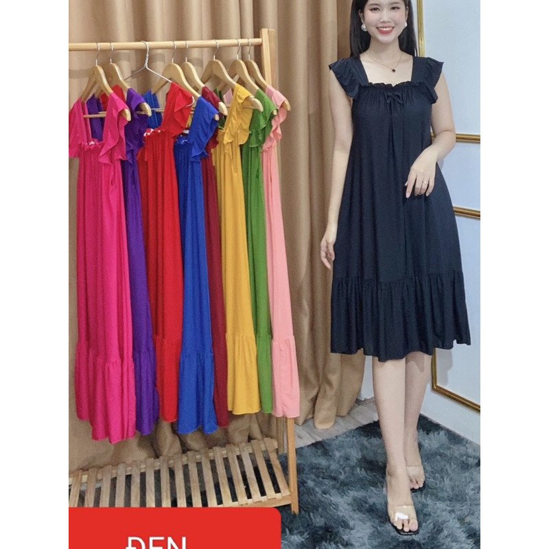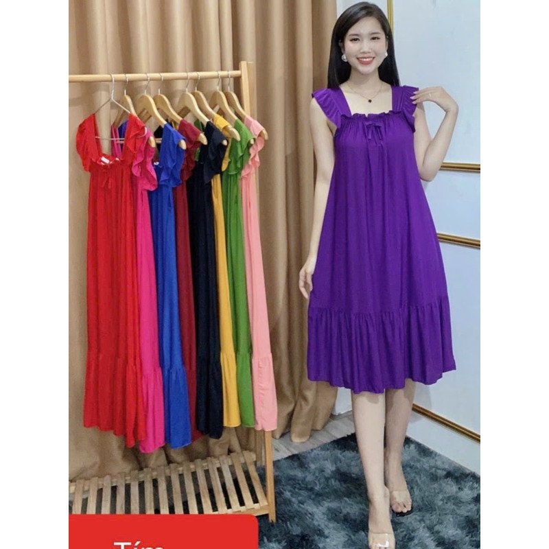 Đầm suông, tay cánh tiên, đuôi bèo, cổ nhún |