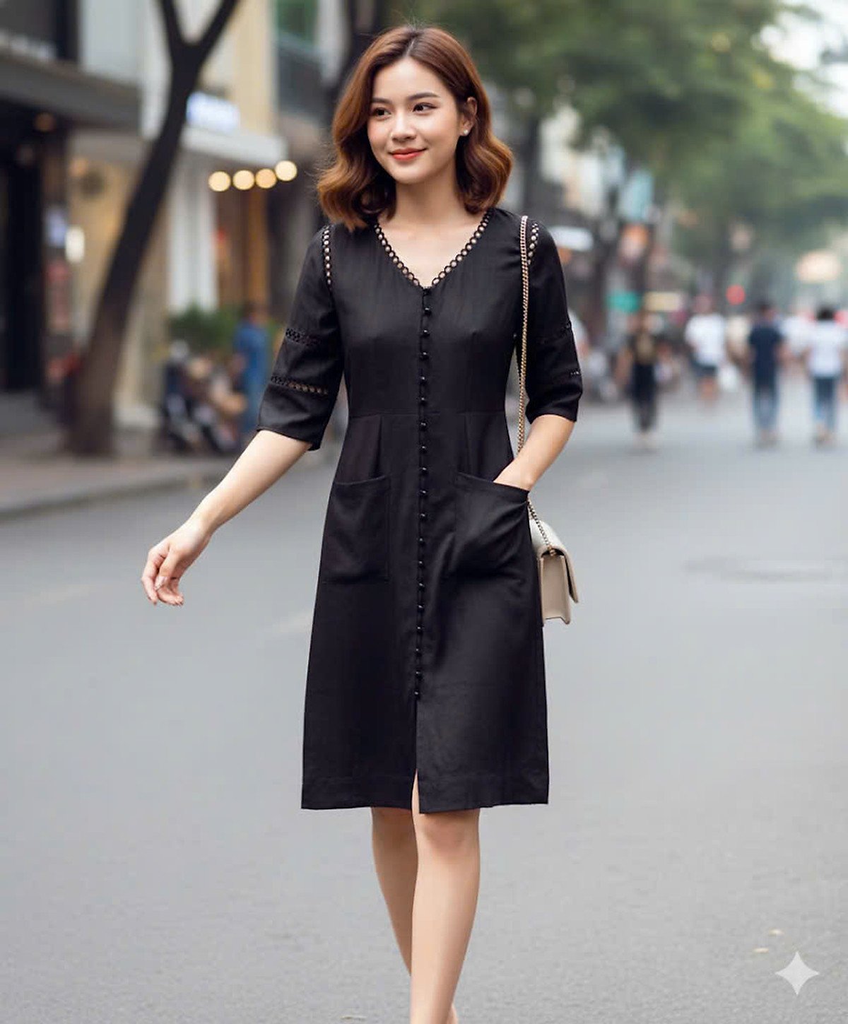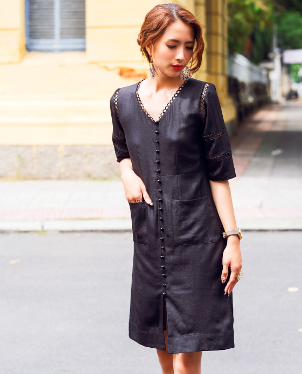 • Phụ kiện đi kèm: Vì đầm đã có nhiều chi tiết ren và hàng nút, bạn nên chọn trang sức tối giản như khuyên tai ngọc trai hoặc một chiếc đồng hồ dây da thanh mảnh.