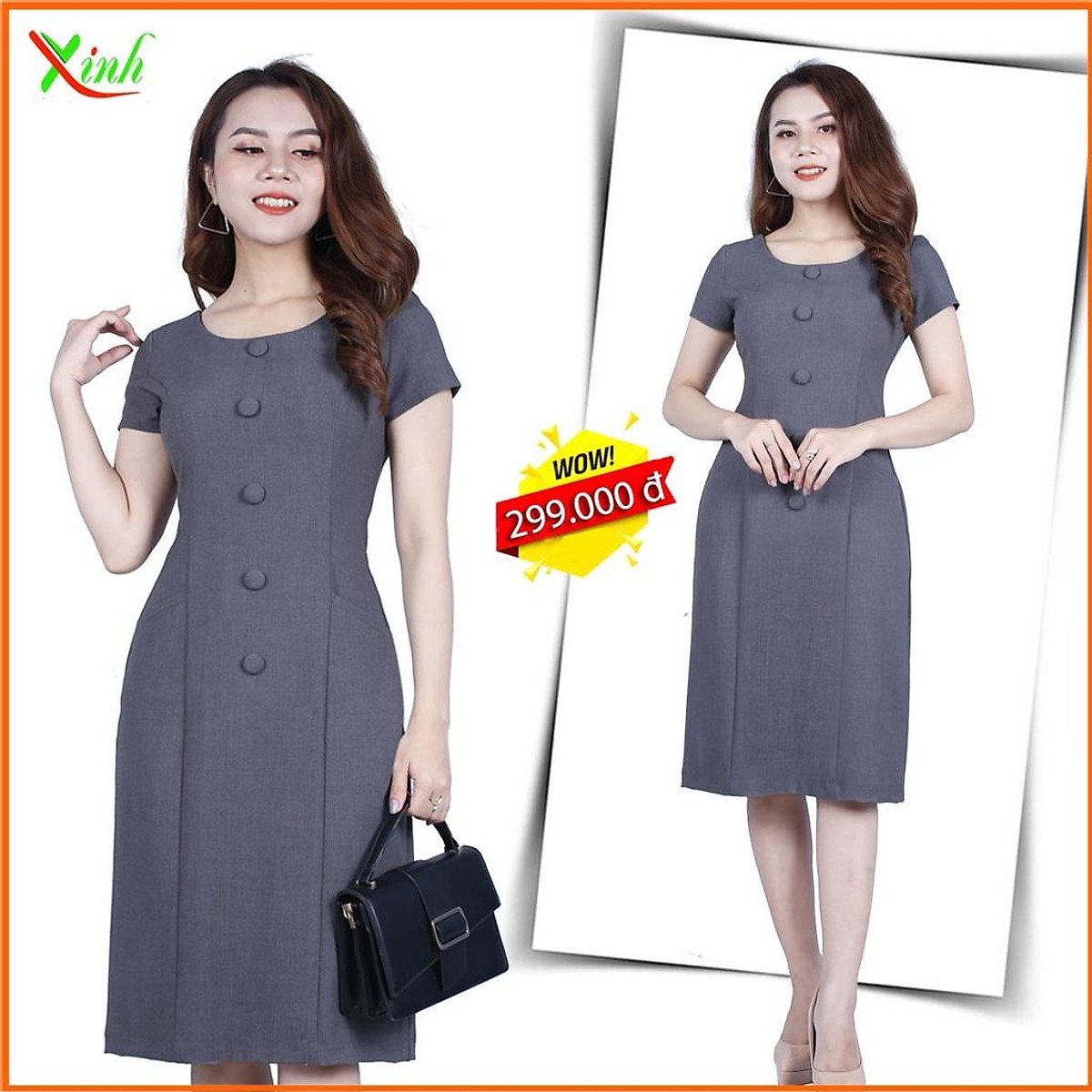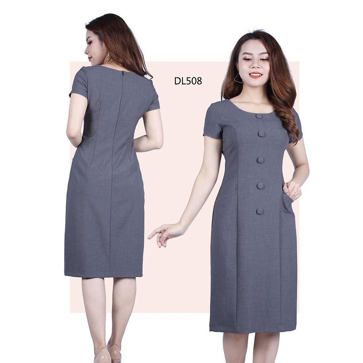 Đầm Suông Xám Tiêu Phối Nút Sang Trọng DL508 – Biểu Tượng Thanh Lịch Cho Nàng Công Sở Hiện Đại