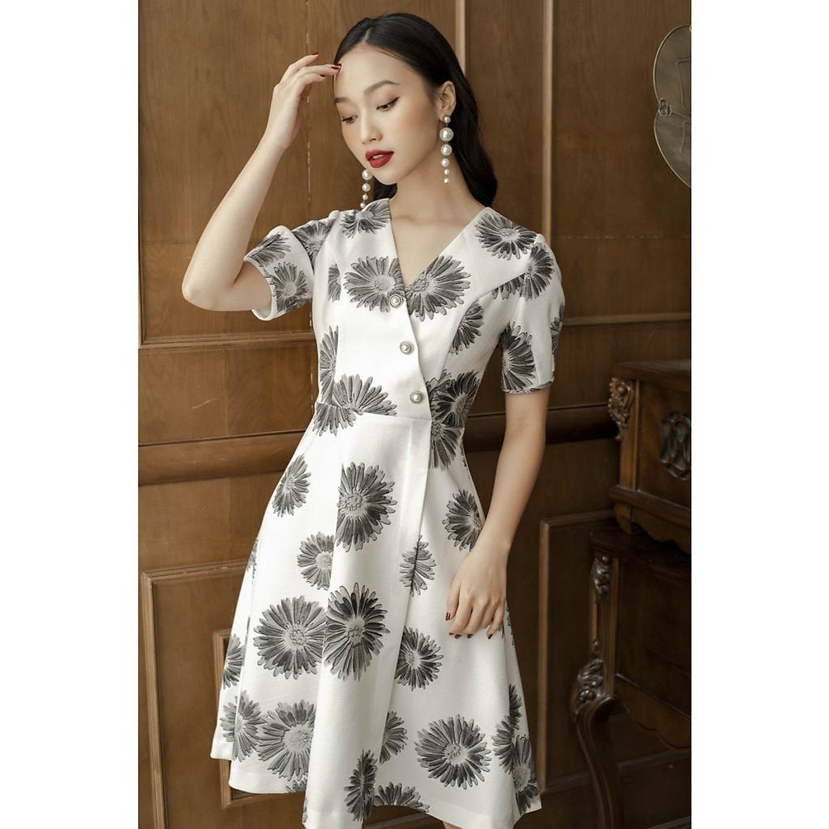 Đầm Xòe Hoa Cúc Luxury Cổ V Tay Bồng Trắng A16420: Vẻ Đẹp Thanh Khiết Cho Nàng Thơ