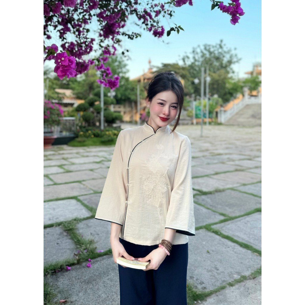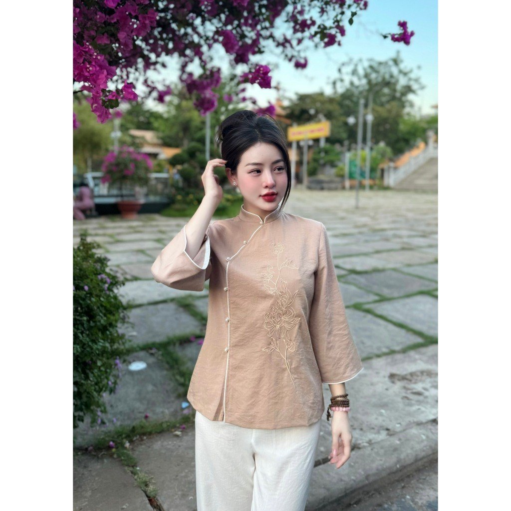 Đồ bộ đi chùa cổ tàu vải đũi Pháp phục lễ chùa khuy chéo cúc ngọc Đồ lam nữ thêu hoa đũi mềm đi tu tập, lễ chùa