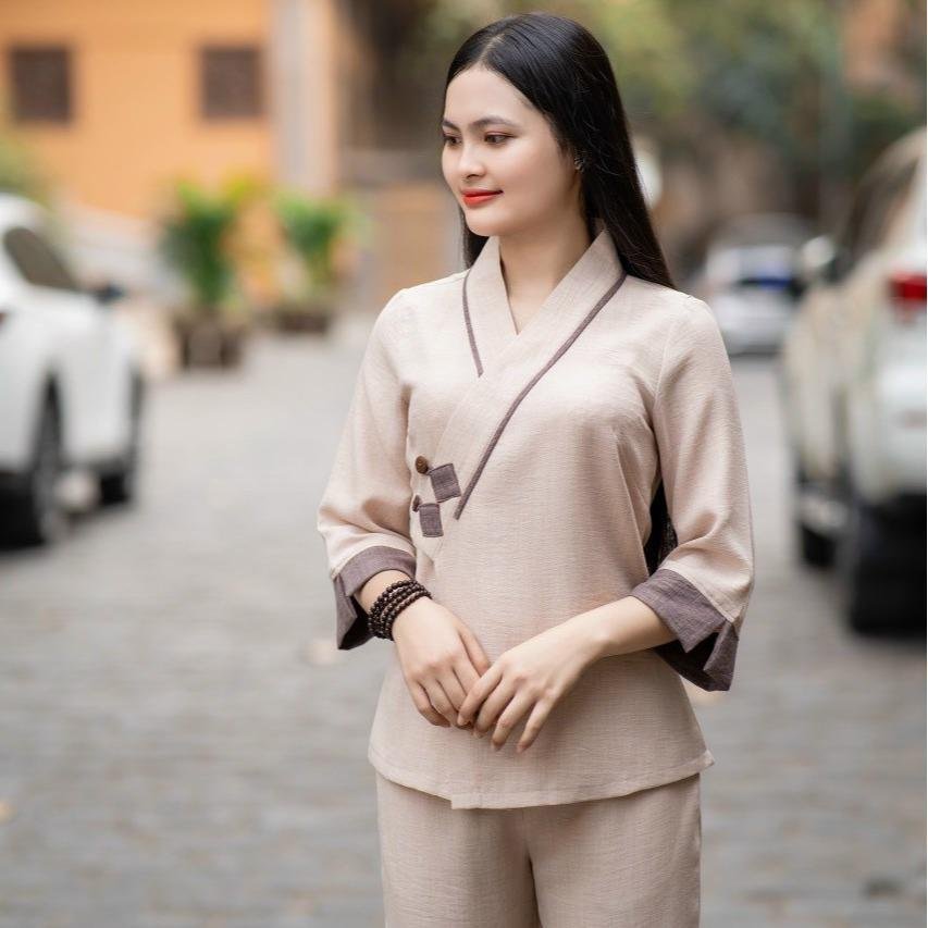 Điểm nhấn ấn tượng nhất của sản phẩm chính là phần cổ y phối với 2 nút gỗ. Chi tiết này được tính toán tỉ mỉ để tạo nên sự duyên dáng, nữ tính nhưng vẫn giữ được vẻ trang nghiêm cần thiết nơi cửa Phật. Nút gỗ tự nhiên mang lại cảm giác mộc mạc, gần gũi với thiên nhiên, phù hợp với tinh thần tu tập và hướng thiện.