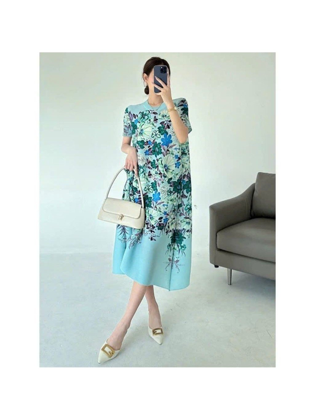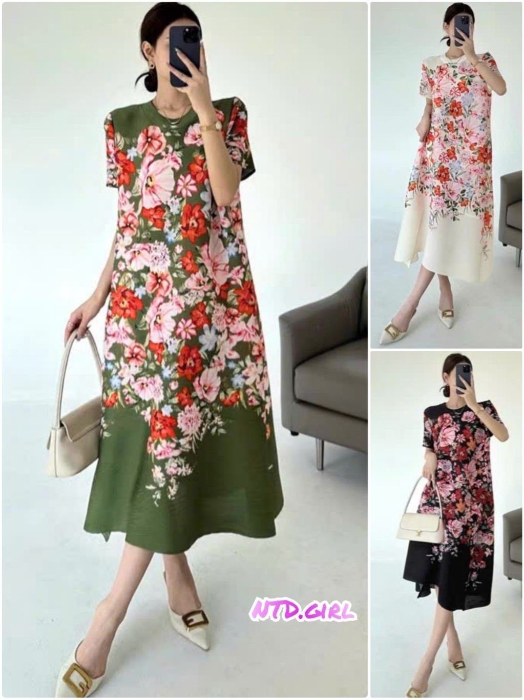 Be the first to review “Hàng nhập – Đầm dáng suông lụa xếp li free size tay ngắn cổ tròn in hoa, váy xuông Quảng Châu form dài đi biển xinh xắn”