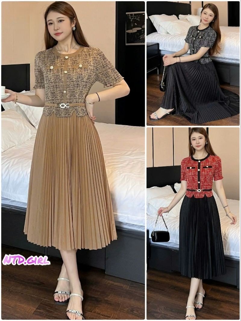 Hàng nhập – Đầm dáng xòe lụa xếp li free size đính nút phối viền, váy dự tiệc Quảng Châu tay ngắn cổ tròn vân xước