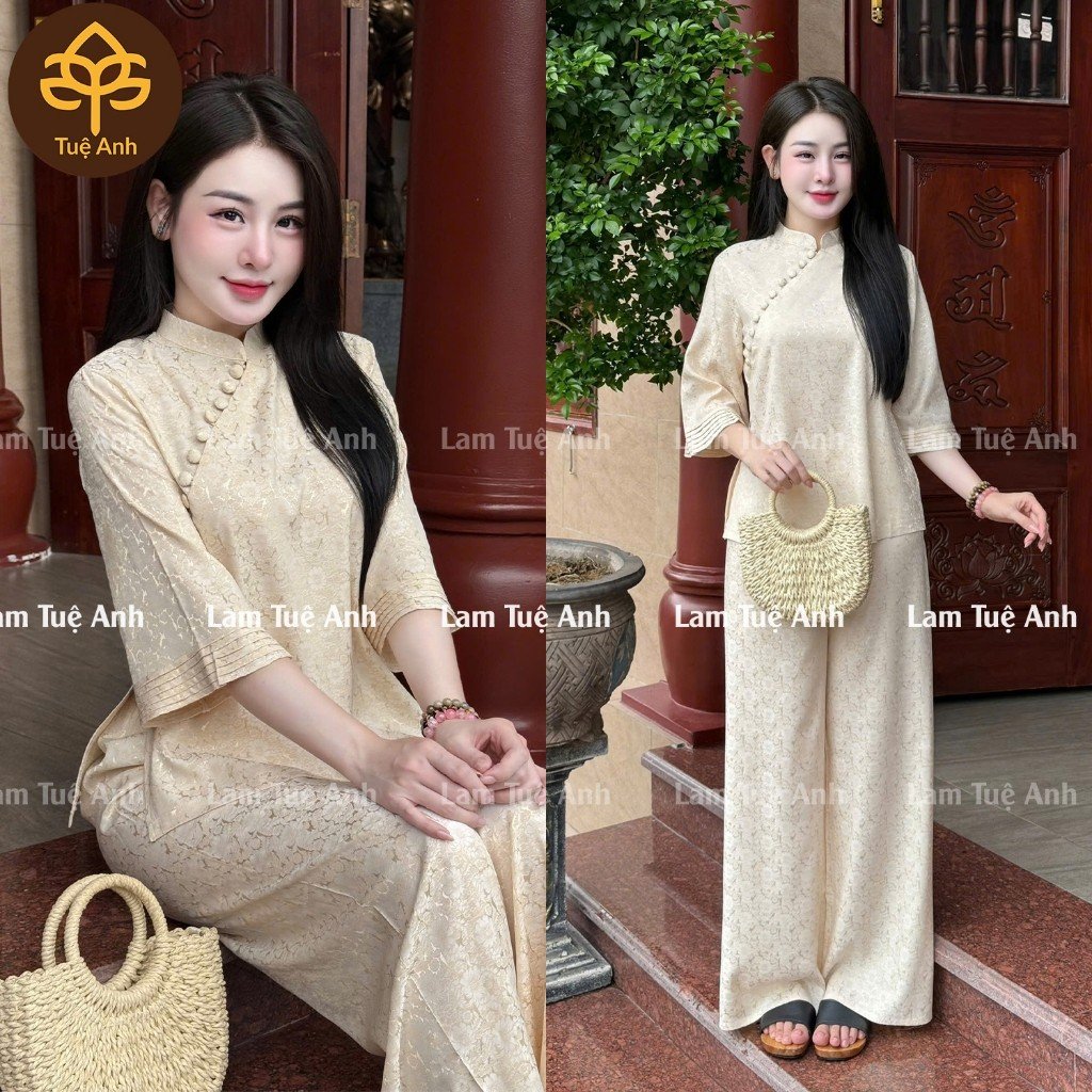 Họa Mi Y không chỉ đơn thuần là một bộ đồ lam đi chùa, mà là sự kết hợp tinh tế giữa nét đẹp truyền thống và hơi thở hiện đại. Điểm nhấn lớn nhất nằm ở chất liệu lụa gấm hoa nổi cao cấp. Đây là loại vải có bề mặt mịn màng, độ bóng nhẹ đặc trưng của lụa, kết hợp với các họa tiết hoa được dệt nổi tinh xảo, tạo nên chiều sâu và sự sang trọng cho trang phục.
