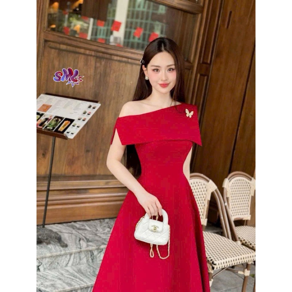 HYNA Thiết kế váy đỏ dự tiệc tiểu thư trễ vai dáng xoè, phù hợp đi cưới, đi chơi tết, đi chơi noel sang chảnh (KÈM TAG)