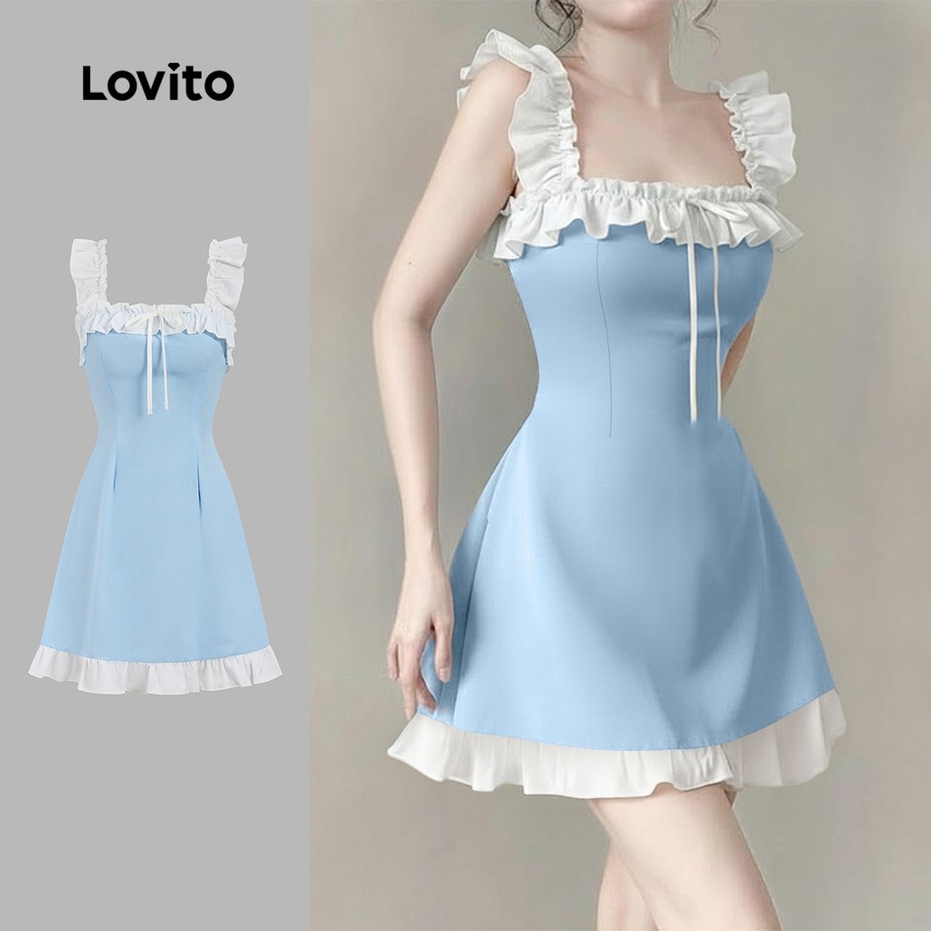 Lovito Váy Nữ Mùa Xuân/Hè Xanh Lam Phối Màu Xòe Viền Bèo Buộc Dây là mẫu váy thời trang mang phong cách trẻ trung, nhẹ nhàng và rất phù hợp cho những ngày dạo phố, đi chơi hoặc đi du lịch. Với thiết kế xòe nữ tính, viền bèo mềm mại cùng chi tiết buộc dây tinh tế, chiếc váy mang đến vẻ ngoài dịu dàng nhưng vẫn nổi bật và thời trang.