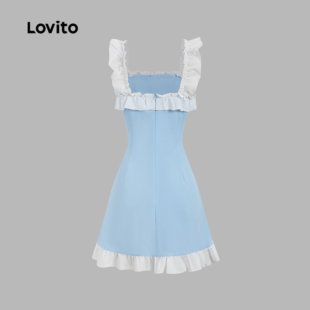 Lovito Váy Nữ Mùa Xuân/Hè Xanh Lam Phối Màu Xòe Viền Bèo Buộc Dây Trang Phục Thường Ngày. L171ED384