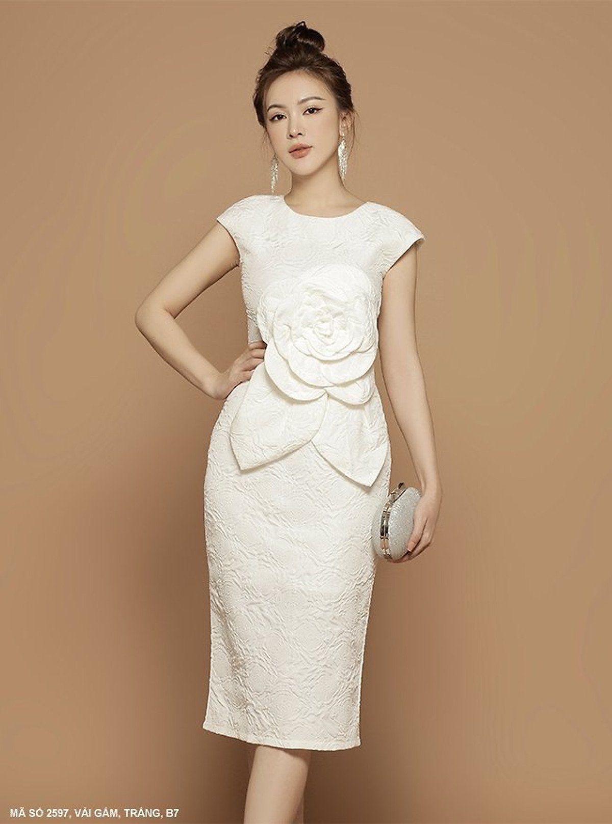 - Trang sức: Do đầm đã có chi tiết kết hoa nổi bật, bạn nên ưu tiên các loại trang sức tối giản như khuyên tai ngọc trai hoặc dây chuyền mảnh bằng vàng trắng để tạo sự cân bằng, sang trọng.