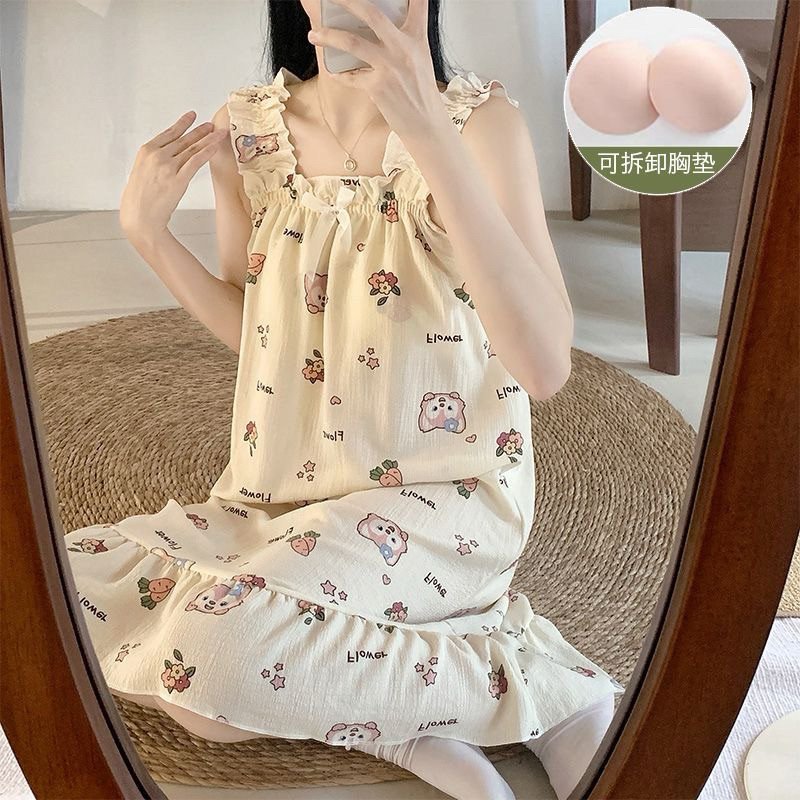 MEIQIYI Đầm ngủ đũi hai dây bản to thắt nơ có kèm mút ngực