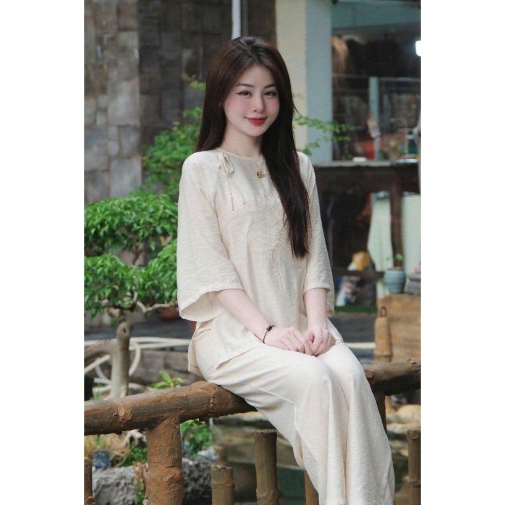 - Sự trang nghiêm: Thiết kế cổ tròn kín đáo và quần dài 1m đảm bảo đúng quy định về trang phục tại các đền, chùa, tịnh xá.