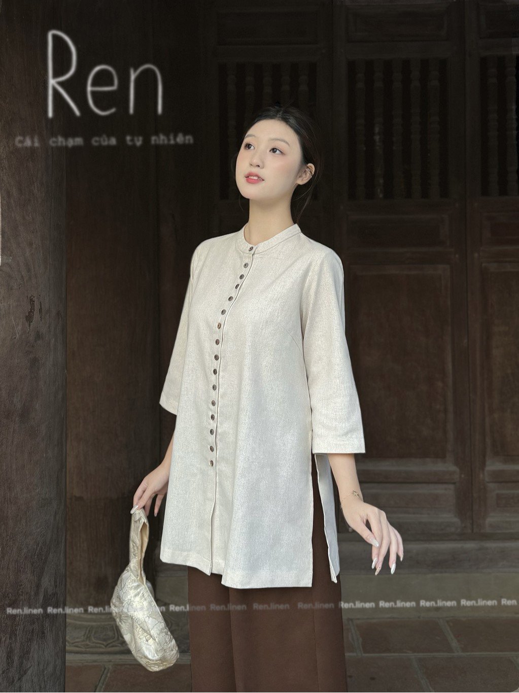 Điểm nhấn đắt giá nhất trên thân áo chính là hàng cúc gỗ kéo dài từ cổ áo xuống. Chất liệu gỗ mộc kết hợp với vải linen tạo nên một tổng thể hài hòa, đậm chất thiền (Zen). Hàng cúc được sắp xếp tỉ mỉ, giúp định hình vóc dáng, tạo cảm giác người mặc trông thanh mảnh và cao ráo hơn.