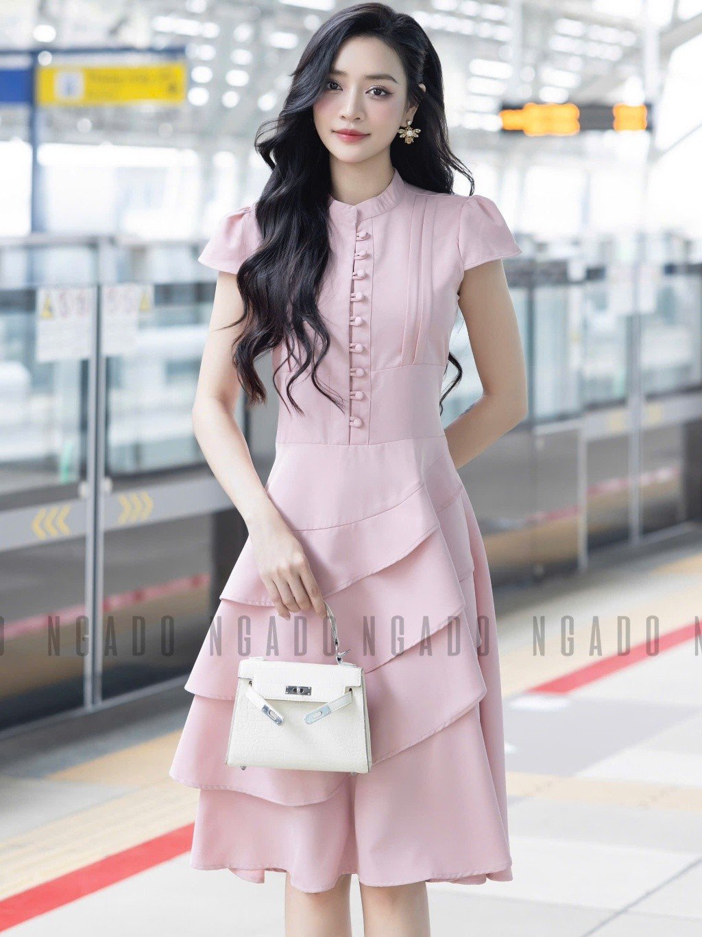 Mỗi sản phẩm [PRE] Đầm hồng ngắn tay NGADO trước khi đến tay khách hàng đều trải qua quy trình kiểm tra chất lượng đa tầng. Từ khâu tuyển chọn sợi vải gân Ý, nhuộm màu độc quyền đến khâu cắt may thủ công bởi những thợ may lành nghề.