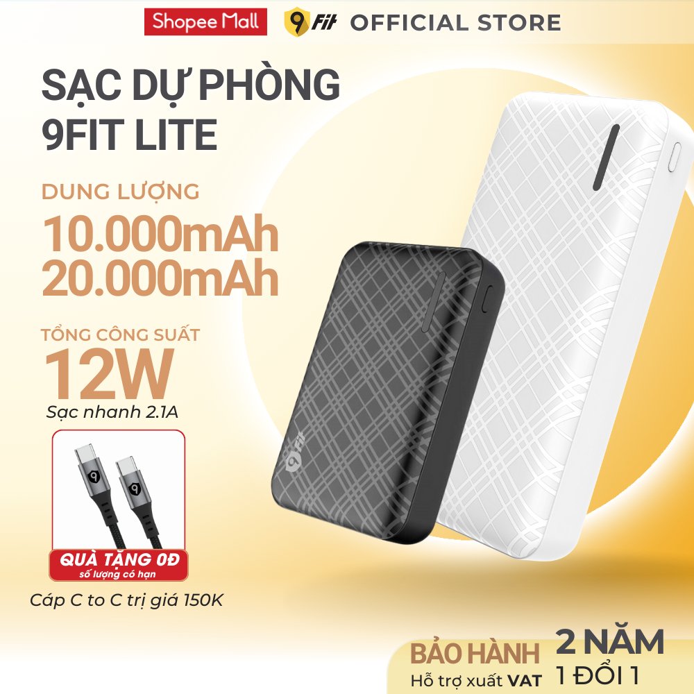 • 9Fit Lite 10 000 mAh Power Bank — dung lượng 10 000 mAh, gồm 2 cổng USB-A (5V/2.1A) + 1 cổng USB-C (5V/2A) hỗ trợ input/output. Tổng công suất đầu ra ~ 10.5–12 W. (9fit.com.vn)