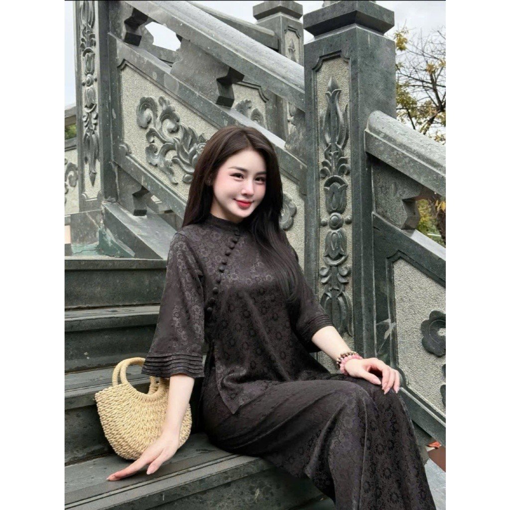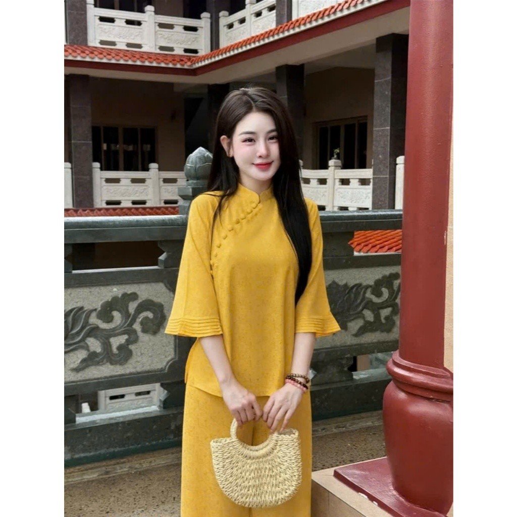 Thiết kế cổ tàu truyền thống kết hợp với hàng cúc thắt khéo léo tạo nên vẻ đẹp kín đáo nhưng vẫn rất thời trang. Form dáng áo hơi suông nhẹ, che khuyết điểm vòng 2 hiệu quả, trong khi quần ống đứng giúp đôi chân trông dài và thon gọn hơn. Đây chính là lựa chọn hoàn hảo để phái đẹp diện đi chúc Tết họ hàng, lễ chùa đầu năm với diện mạo trang nhã, thành kính.