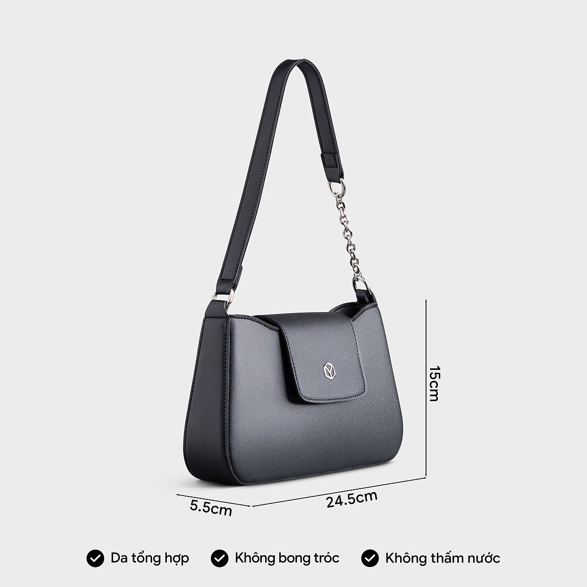 * **Chiều rộng 5.5cm:** Là độ rộng lý tưởng để chiếc túi không quá cồng kềnh, ôm sát cơ thể một cách duyên dáng nhưng vẫn đủ không gian để đựng các vật dụng cần thiết mà không làm túi bị biến dạng. Độ rộng này cũng giúp túi giữ form tốt hơn.