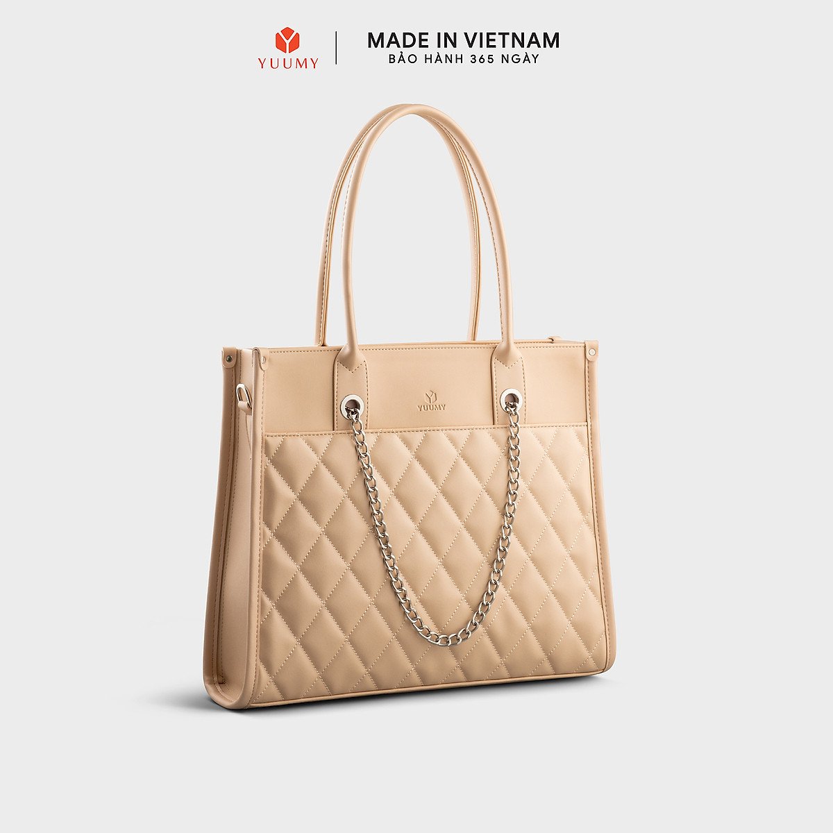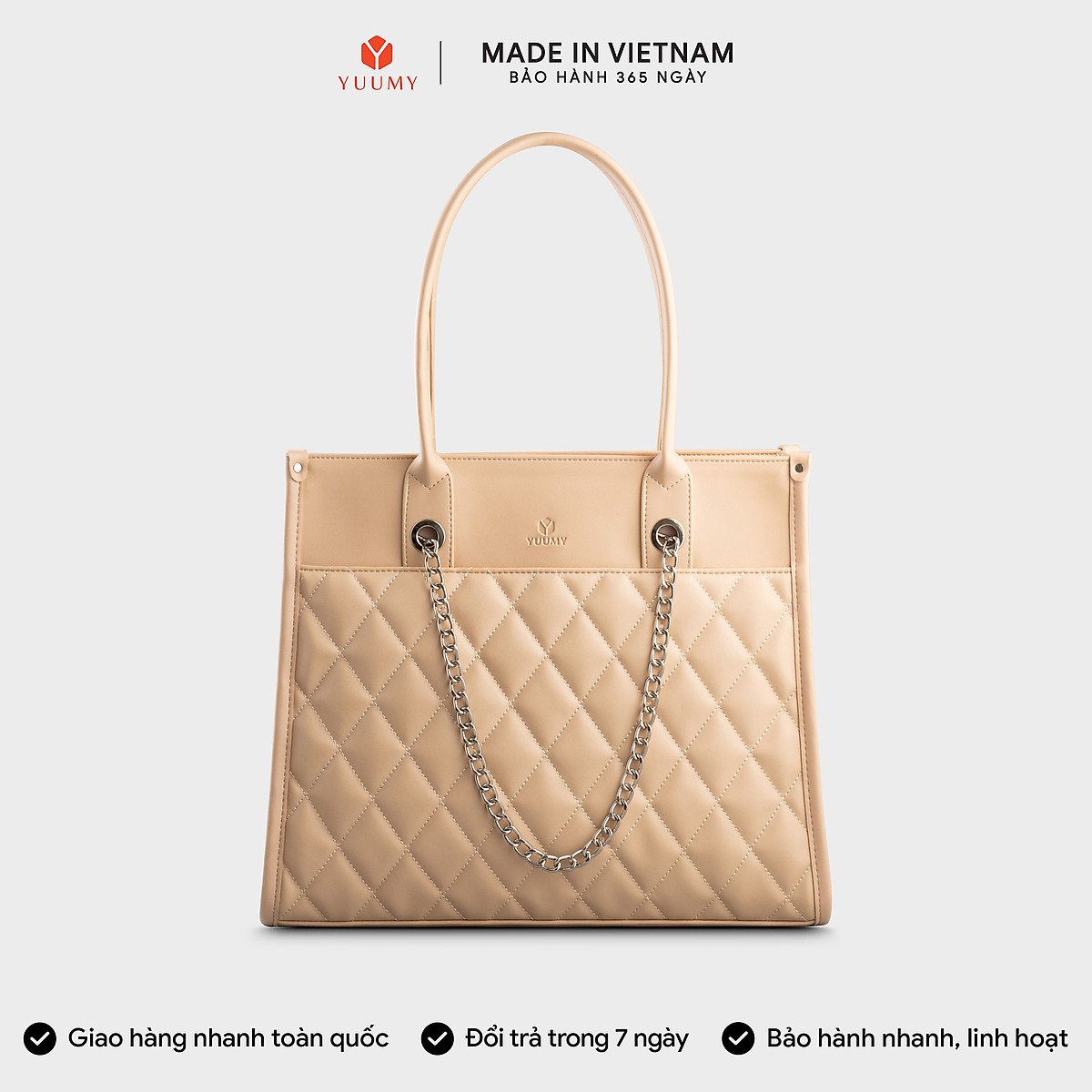 Bên cạnh đó, chi tiết dây xích kim loại trang trí là yếu tố then chốt giúp Yuumy YTX65 thoát khỏi khuôn khổ của một chiếc túi công sở thông thường. Dây xích được bố trí một cách khéo léo, không quá phô trương nhưng đủ để thu hút ánh nhìn, tạo điểm nhấn lấp lánh và phá cách. Chất liệu kim loại cao cấp của dây xích không chỉ bền bỉ mà còn mang lại vẻ đẹp sang trọng, hiện đại, dễ dàng kết hợp với các phụ kiện kim loại khác như đồng hồ hay trang sức. Sự kết hợp giữa bề mặt da chần bông mềm mại và dây xích kim loại cứng cáp tạo nên một tổng thể hài hòa, cân bằng, toát lên vẻ đẹp mạnh mẽ nhưng vẫn đầy nữ tính. Đây chính là minh chứng cho khả năng sáng tạo không ngừng của Yuumy trong việc mang đến những sản phẩm vừa đáp ứng xu hướng, vừa giữ được giá trị thẩm mỹ bền vững.